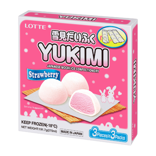 Made in : JAPAN Storage : Frozen Gluten free : O X - Animal free : O X - Yukimi Daifuku (Japanese: "Yukimi daifuku") is a brand of mochi ice cream manufactured by Lotte. It was also released in Japan in October 1981.